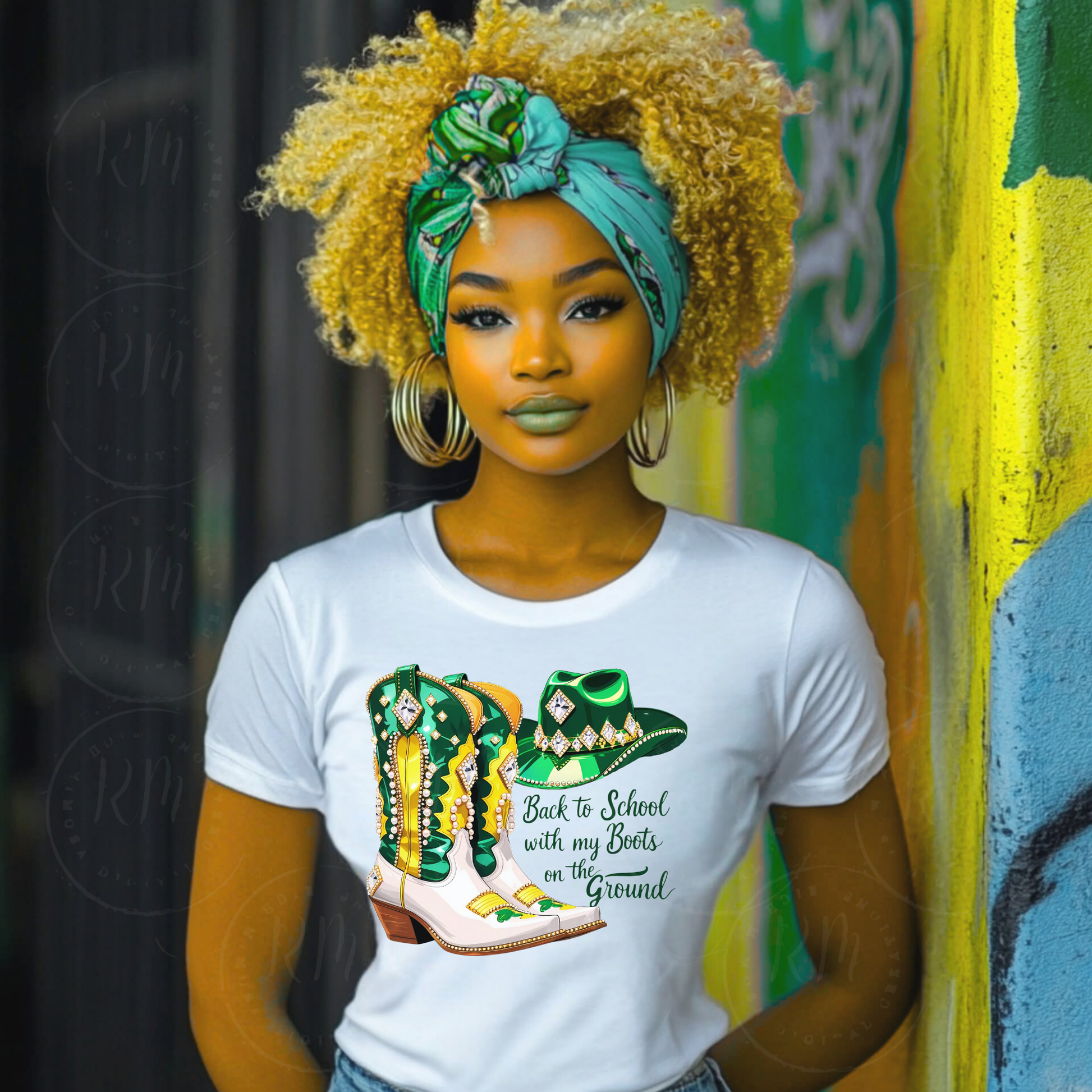 Back to School Boots on the Ground Clipart, Green, Yellow & White Rhinestone Cowgirl Boots and Hat PNG, Western Glam Shirt Design