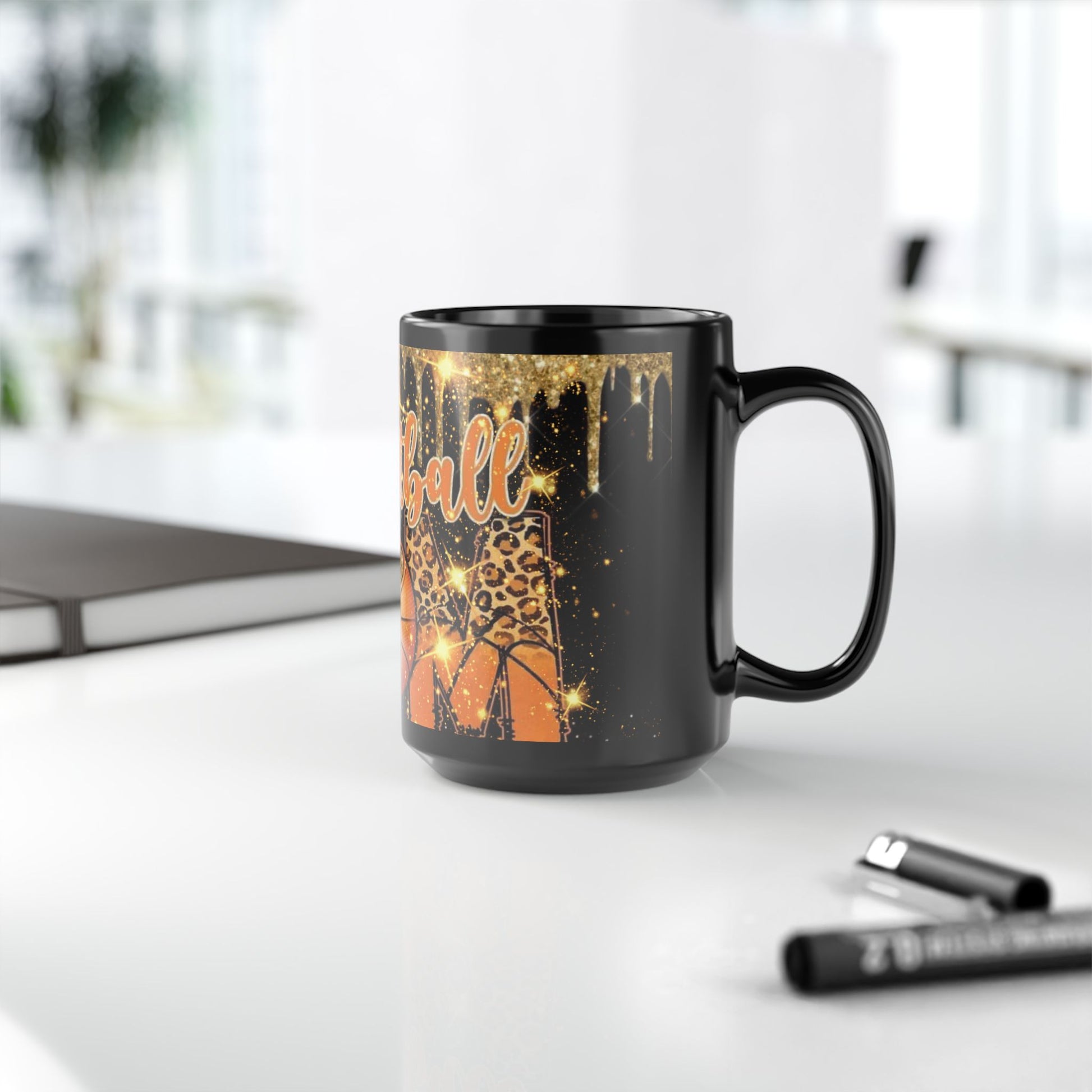 Basketball Mom Black Mug, 15oz with Dripping Gold Design and Sparkles - Gift for Sports Moms, Basketball Fans - Christmas Present, Birthday