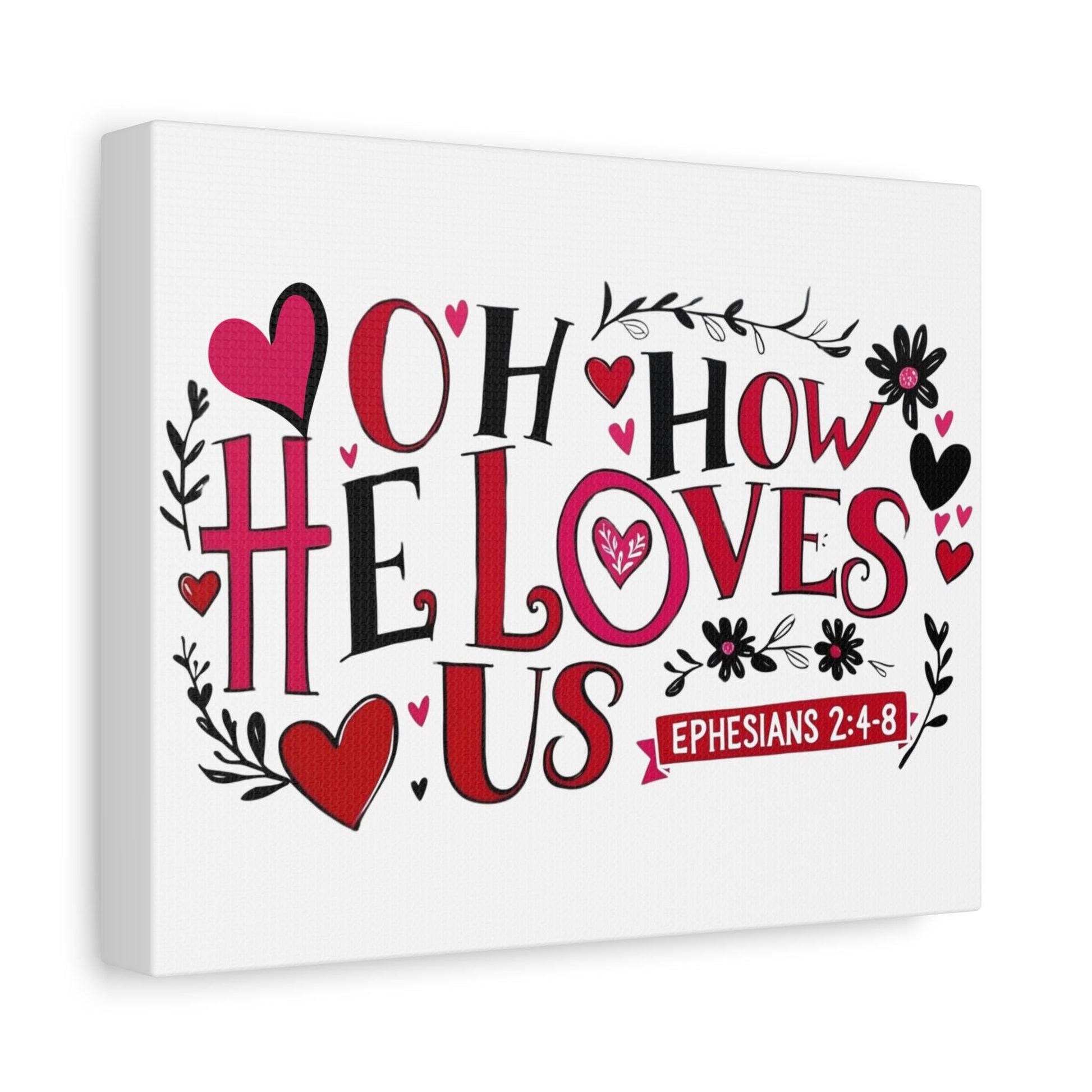 This Matte Canvas, Stretched, features the quote "Oh How He Loves Us" from Ephesians 2:4-8, beautifully designed with red, pink, and black colors, hearts, and flowers. Perfect for creating a warm and loving atmosphere in any room, this canvas print is relevant for religious holidays, home decor enthusiasts, and those seeking a heartfelt touch in their living space.