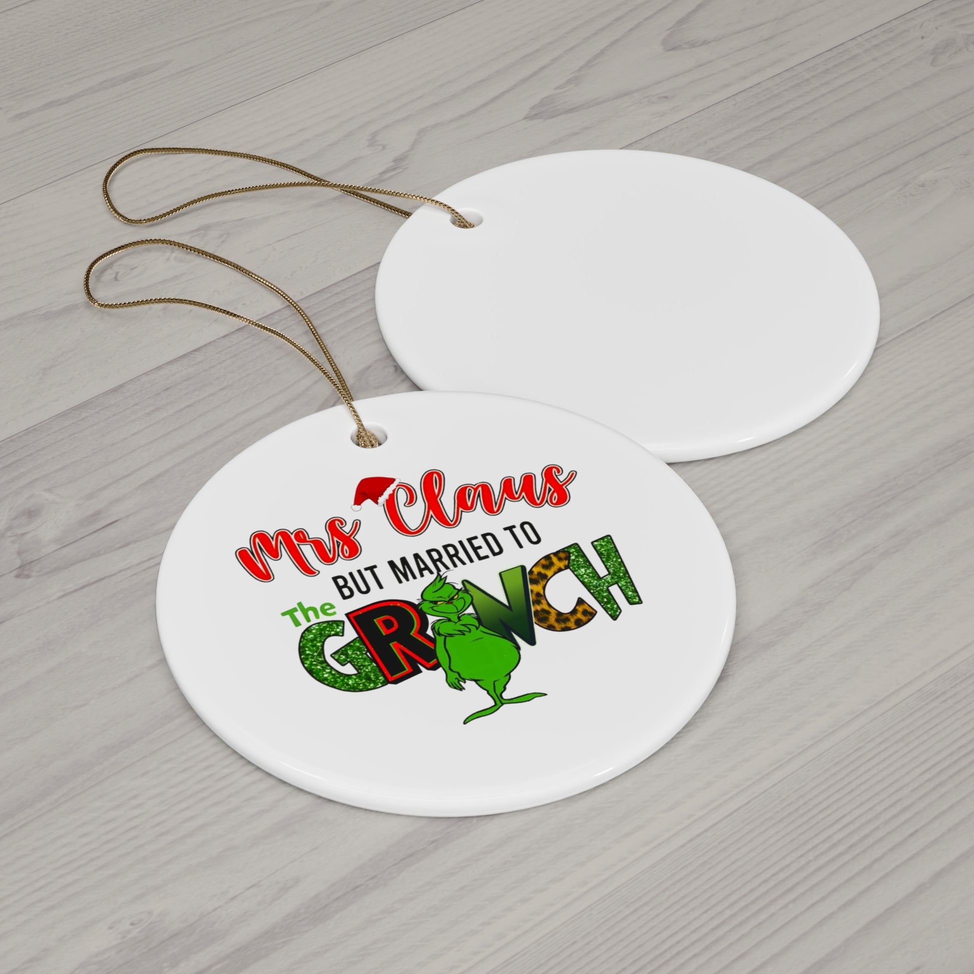 A Christmas-themed ceramic ornament featuring vibrant colors and a quote that says "Mrs. Clause married to the Grinch." This ornament is perfect for adding a touch of holiday cheer to your Christmas tree or gifting to a friend who loves unique decorations. Ideal for those who enjoy festive decor and celebrating the holiday season. Product features - Vibrant colors with crisp designs - Solid one-piece construction for durability - Comes with a gold-toned hanging string - Glossy finish for a polished look - Available in 3 shapes: Snowflake, Heart, Round Care instructions - Gently wipe the dirt or dust off with a clean, dry microfiber cloth
