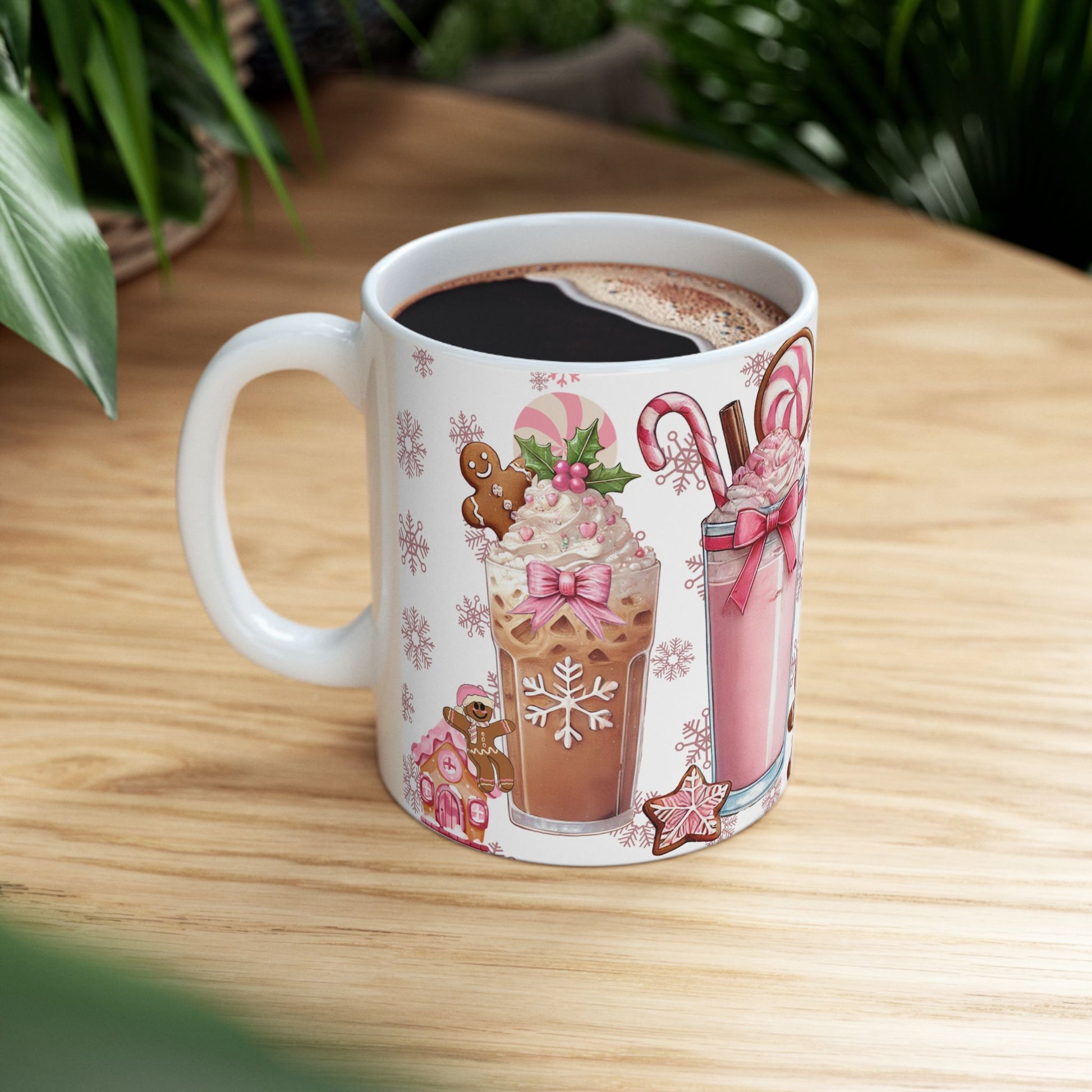 Christmas Holiday Pink Themed Ceramic Mug with Festive Drinks Design, 11oz, 15oz