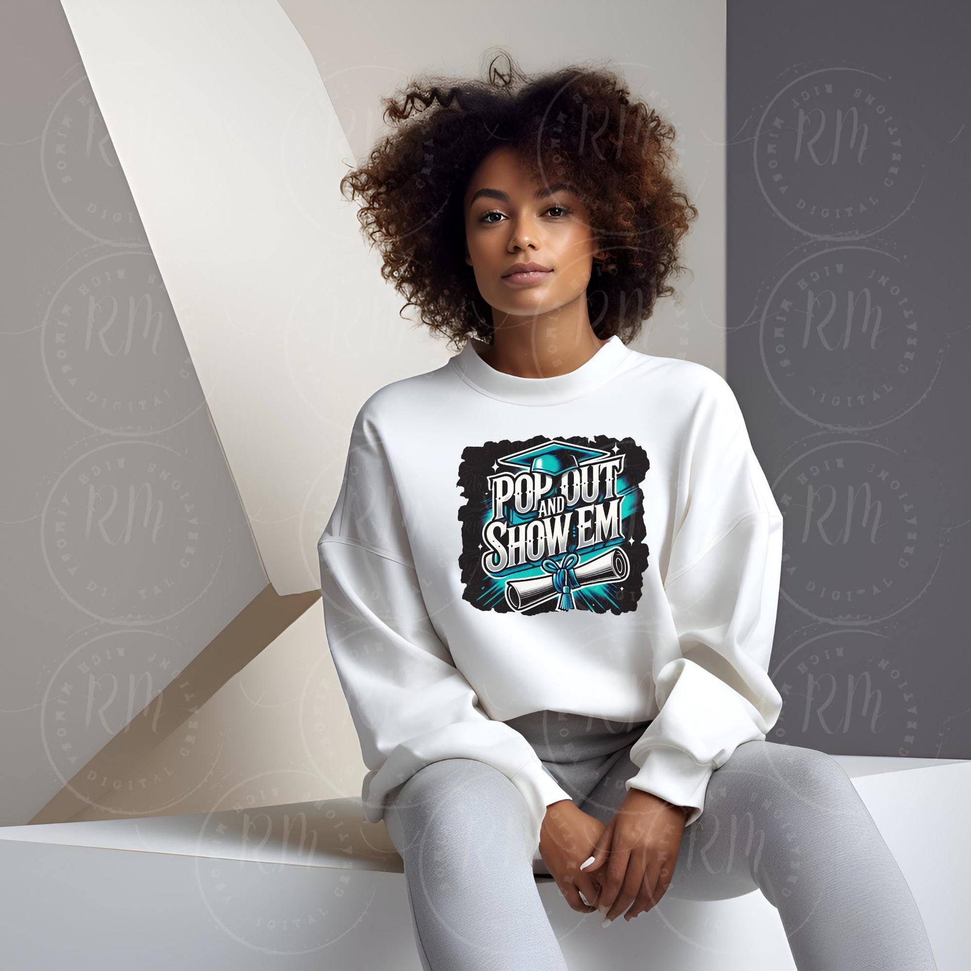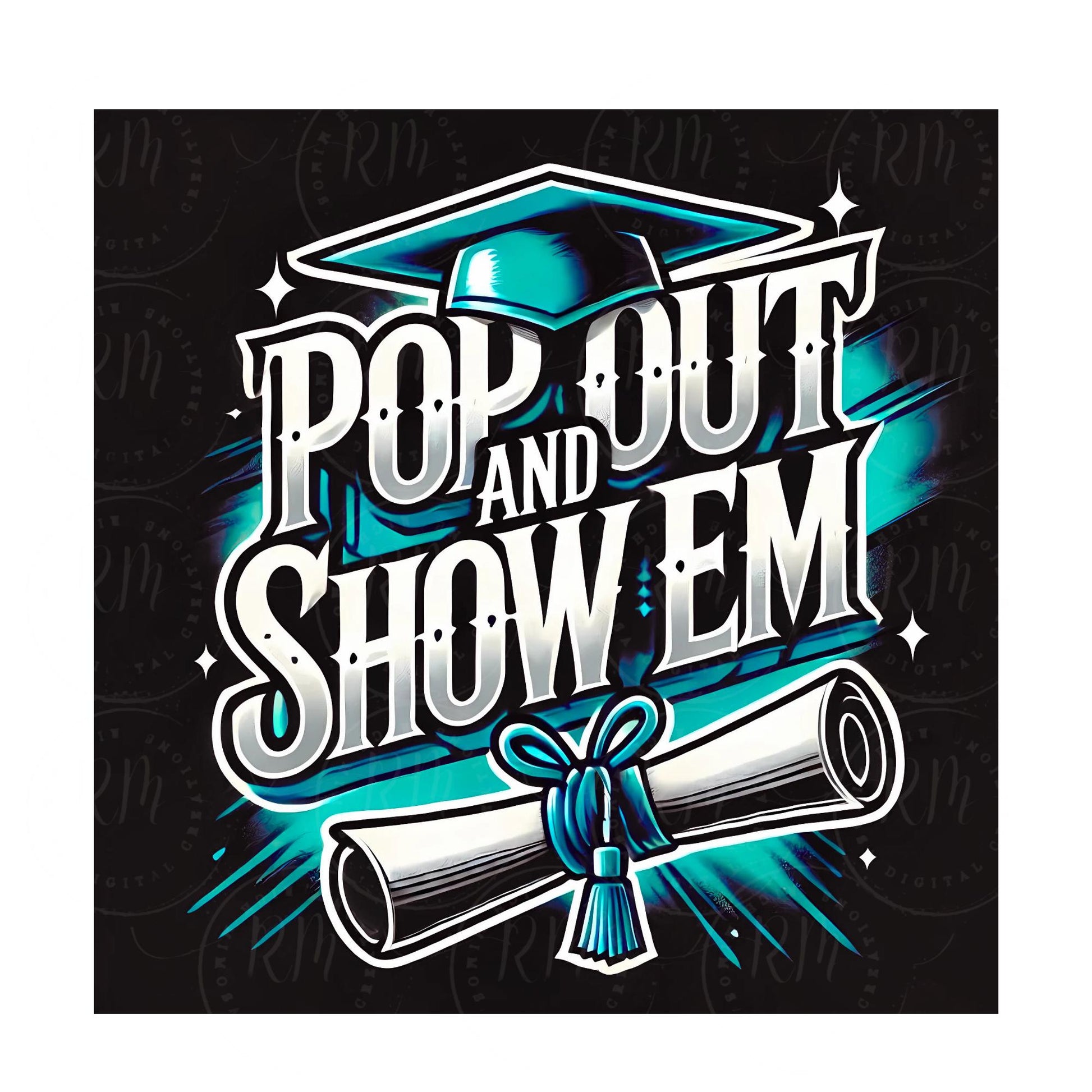 Pop Out and Show Em – because this ain't no quiet graduation moment. This bold, stylish PNG celebrates the Class of 2025 in full flex mode. Featuring sharp, graffiti-inspired lettering with a graduation cap and diploma, this design comes in two versions: