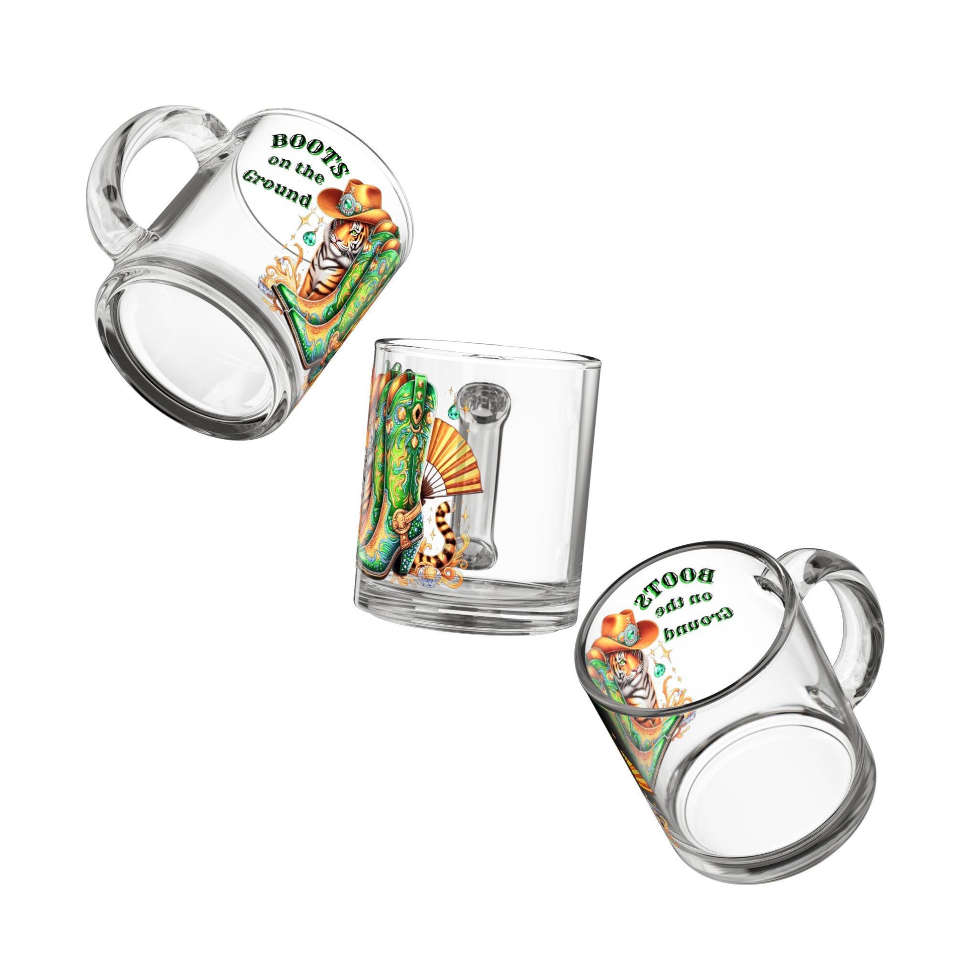 The Boots on the Ground Glass Mug is a unique and fun coffee cup with a western design featuring cowboy boots and a tiger wearing a cowboy hat. This 10oz mug is perfect for those who love country living and want to add some personality to their morning routine. It makes a great gift for cowboy enthusiasts or those who appreciate quirky drinkware. Ideal for birthdays, holidays, or just to add a pop of color to your kitchen.