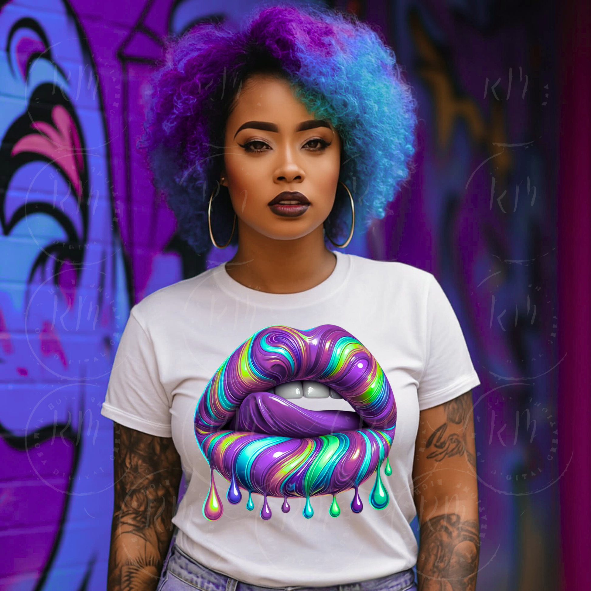Make your creations stand out with this Purple & Aqua Swirl Dripping Lips PNG. Featuring glossy purple, teal, blue, and neon swirl tones, this vibrant lip design is ideal for sublimation, digital art, t-shirts, mugs, tumblers, and wall prints. High-quality PNG with a transparent background makes it easy to layer onto any design project.