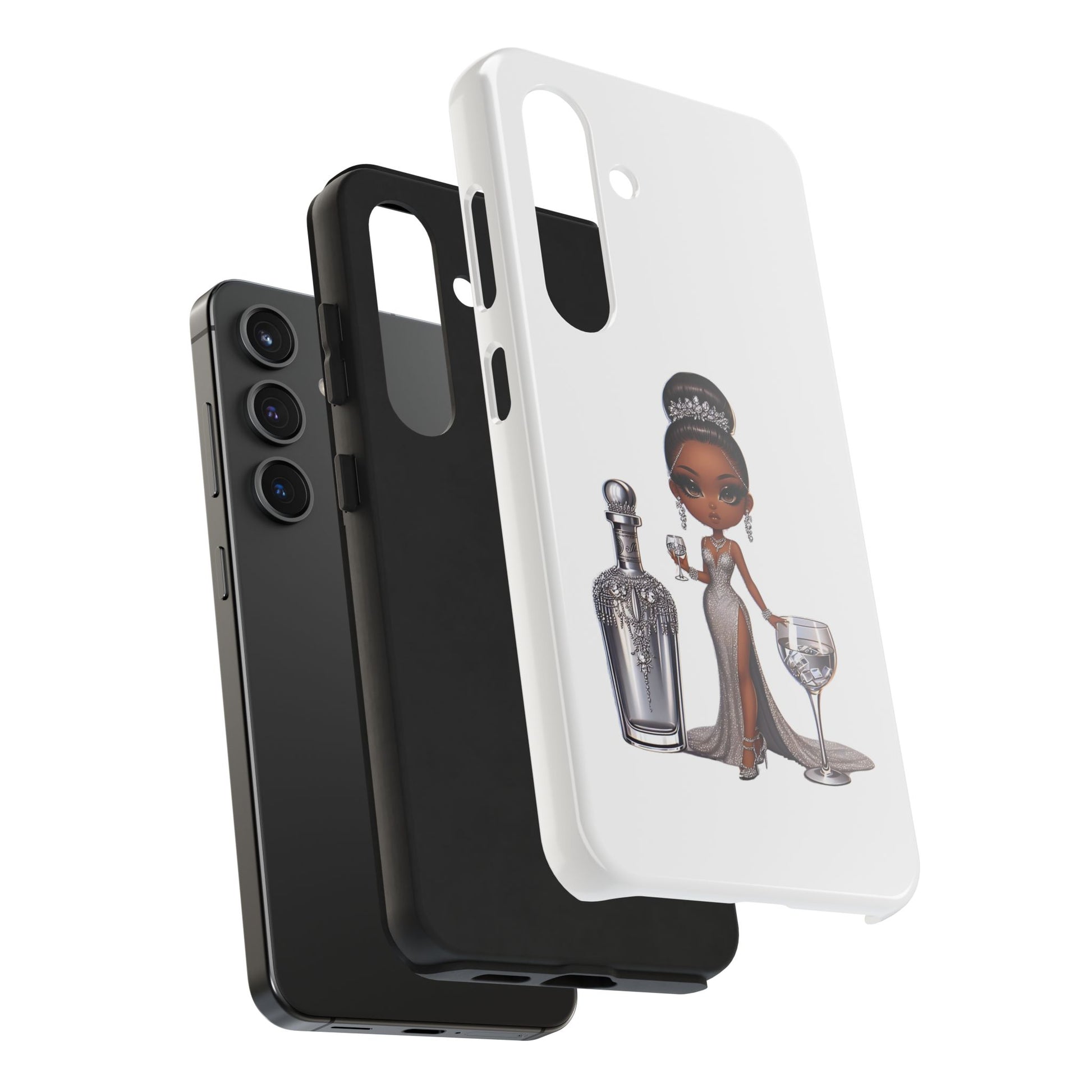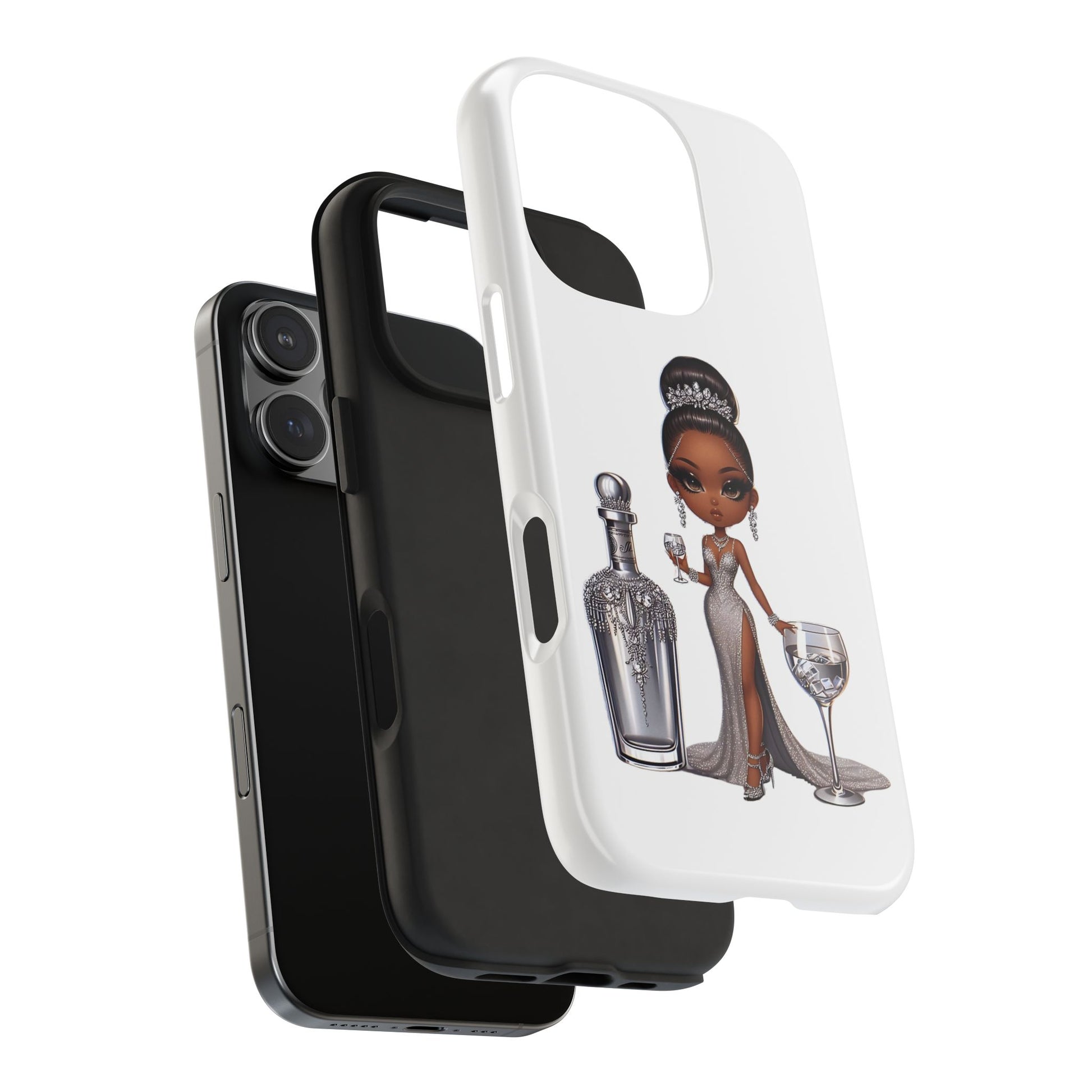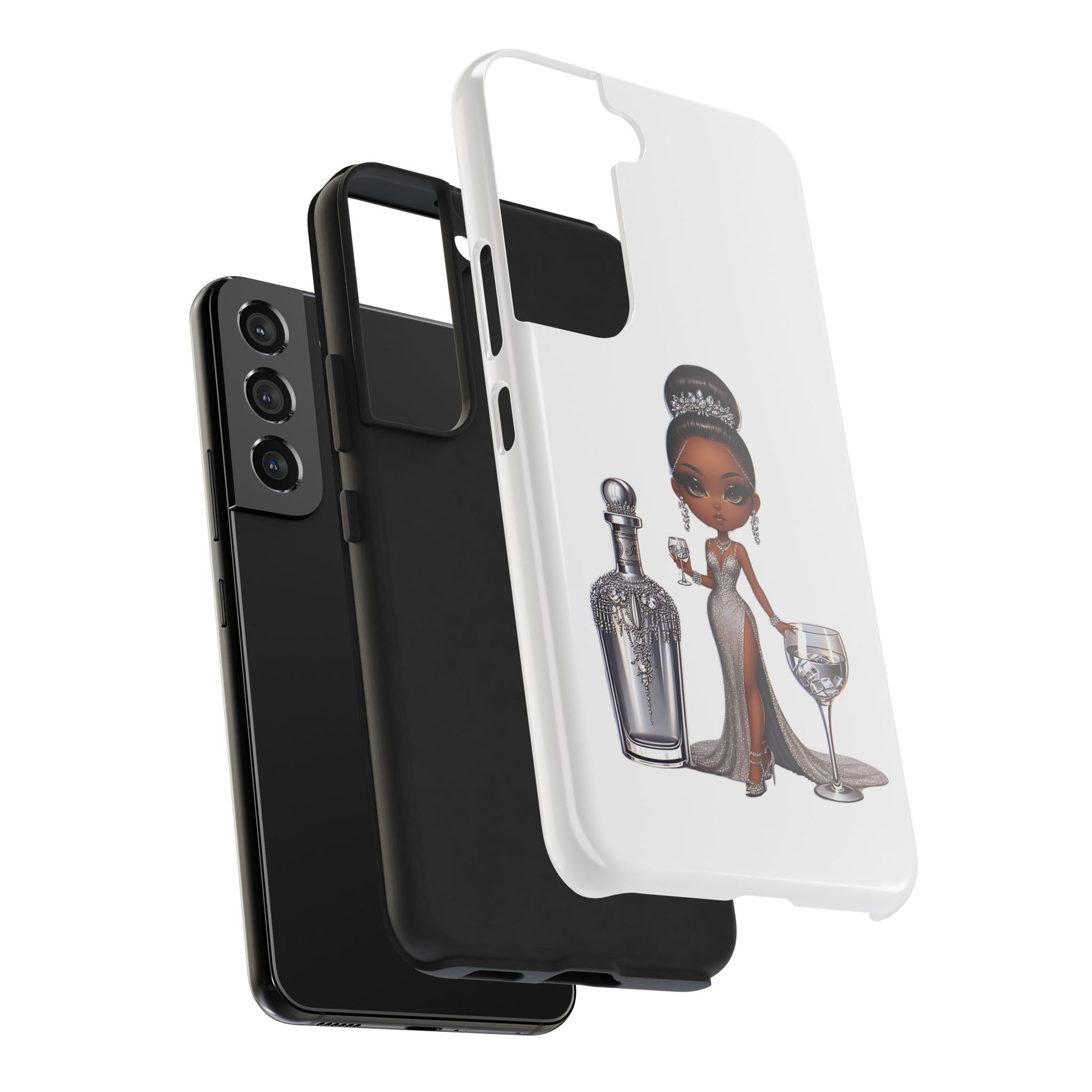 Stylish and durable phone case featuring a beautiful black female in formalwear design on a white base. This phone protector is perfect for someone looking for a strong and impact-resistant case that also adds a touch of elegance to their phone. Ideal for individuals who appreciate high-quality accessories and want to protect their phone in style. Great for gifting during special occasions like birthdays or holidays.