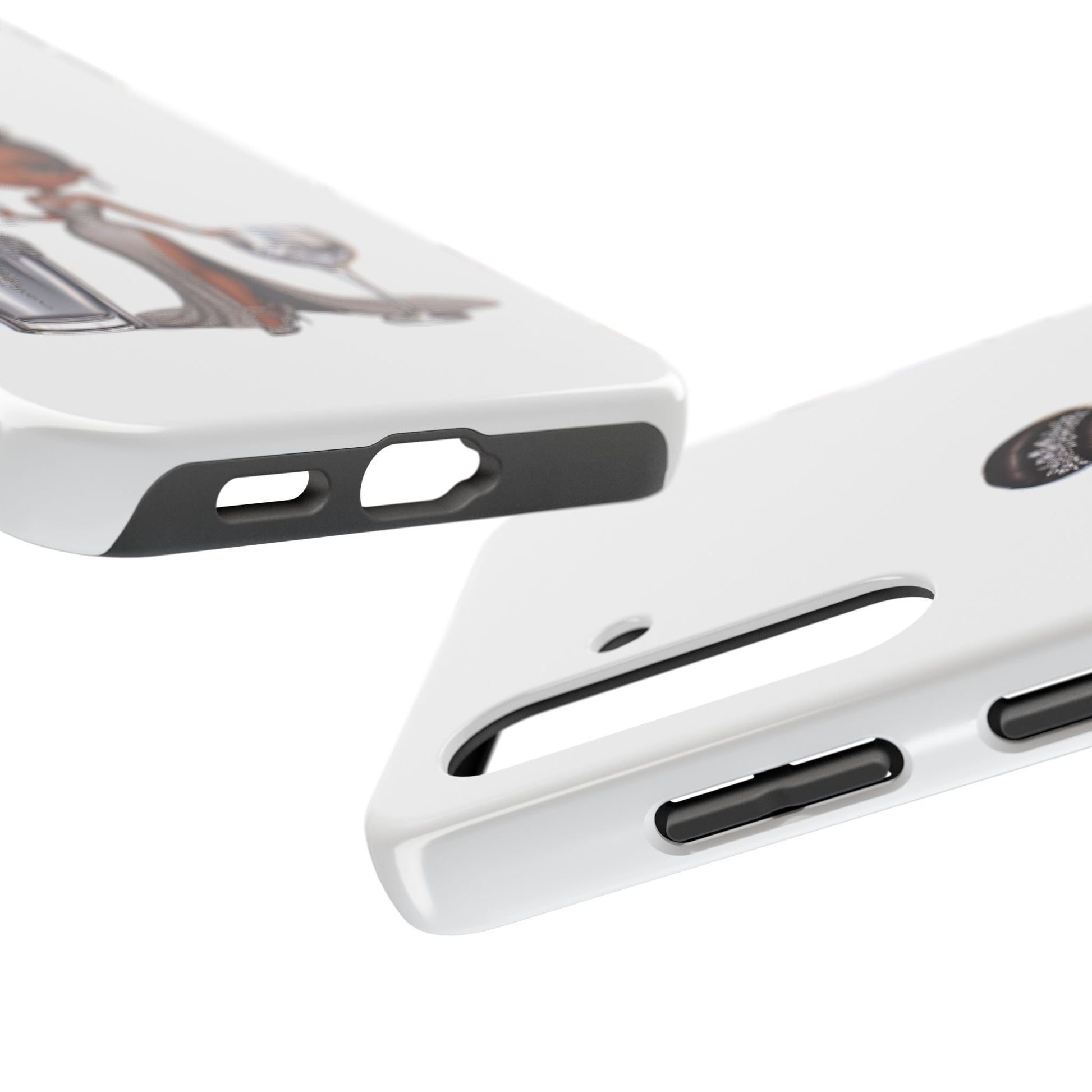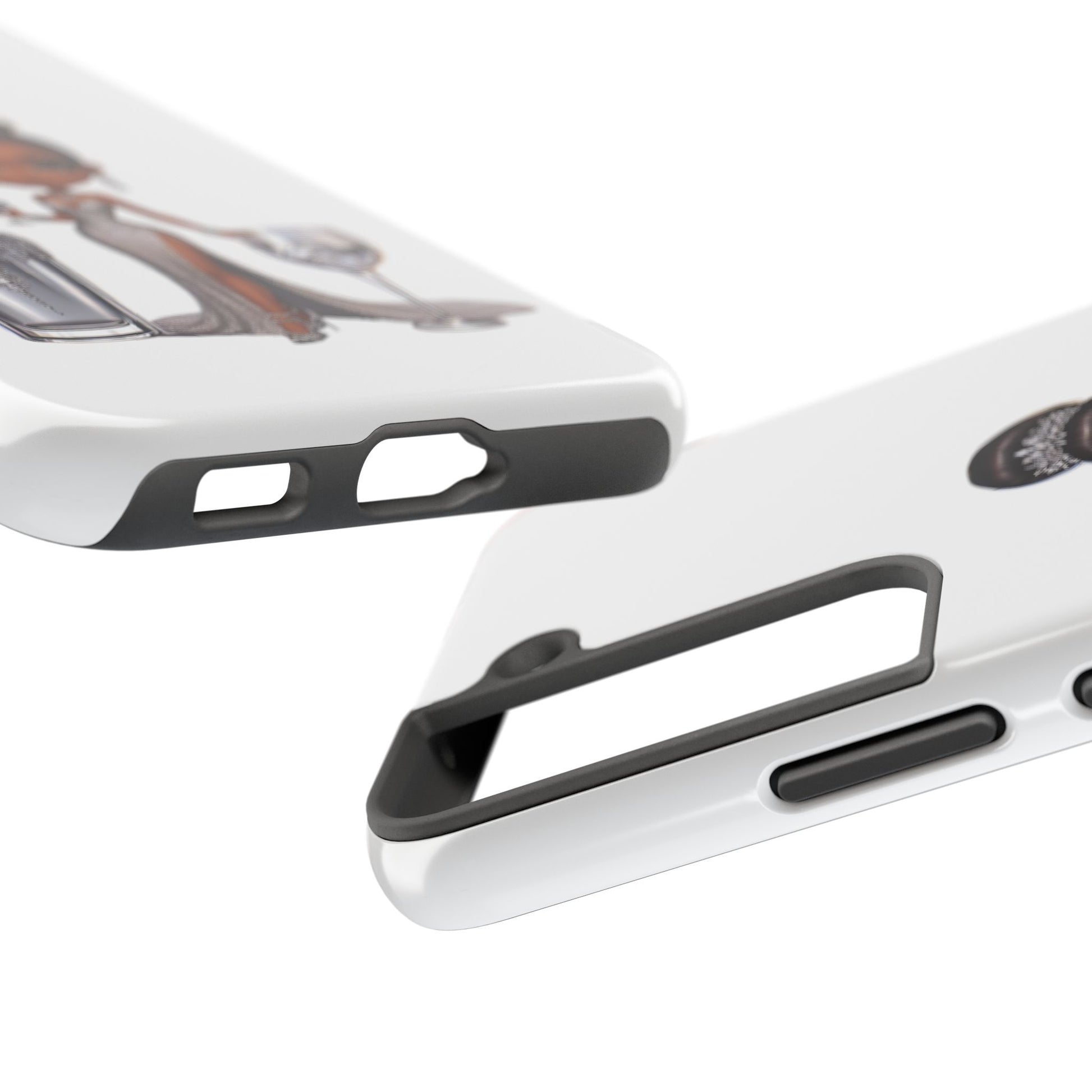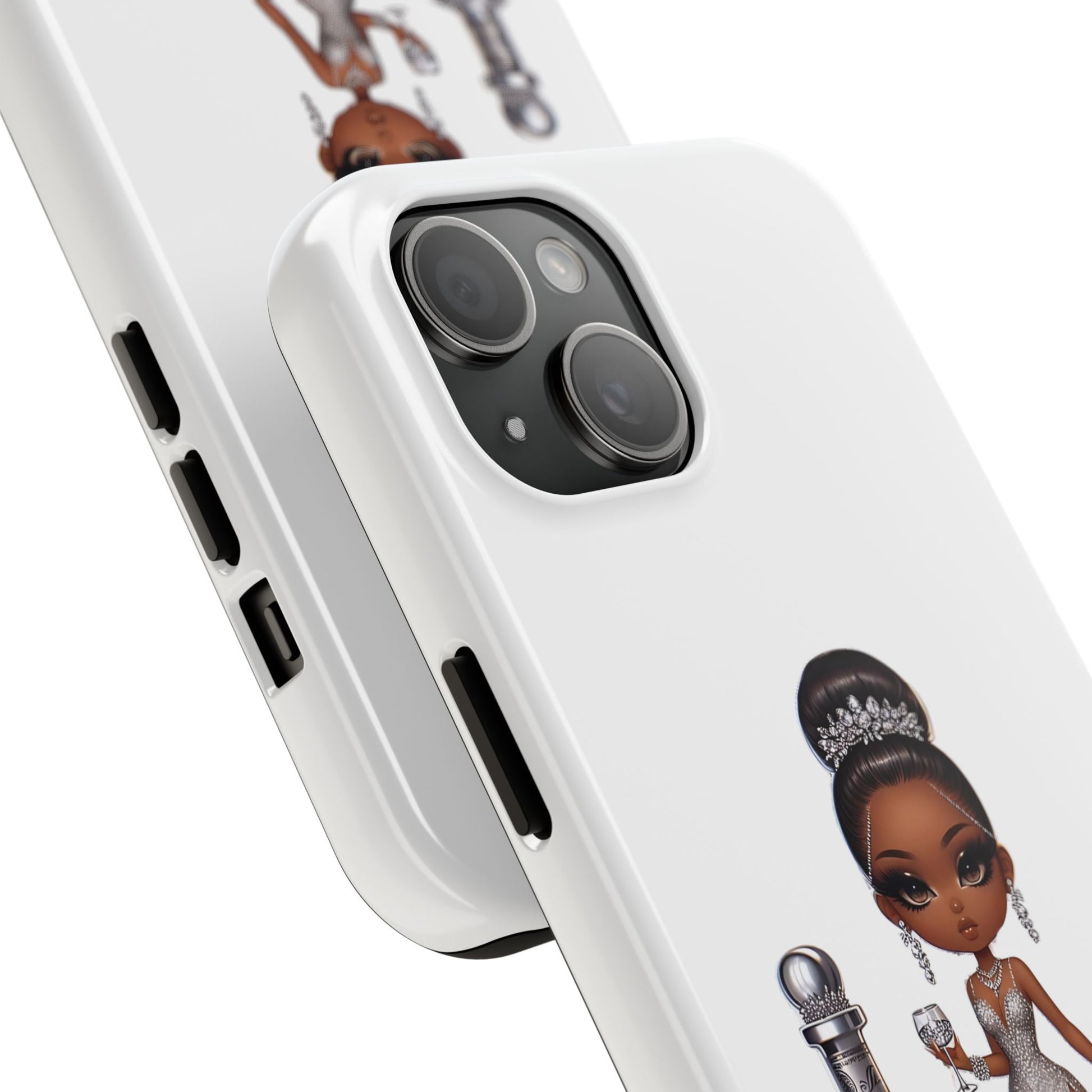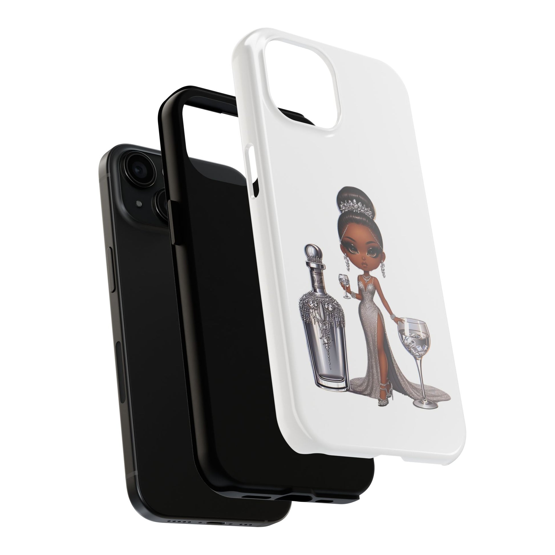 Stylish and durable phone case featuring a beautiful black female in formalwear design on a white base. This phone protector is perfect for someone looking for a strong and impact-resistant case that also adds a touch of elegance to their phone. Ideal for individuals who appreciate high-quality accessories and want to protect their phone in style. Great for gifting during special occasions like birthdays or holidays.