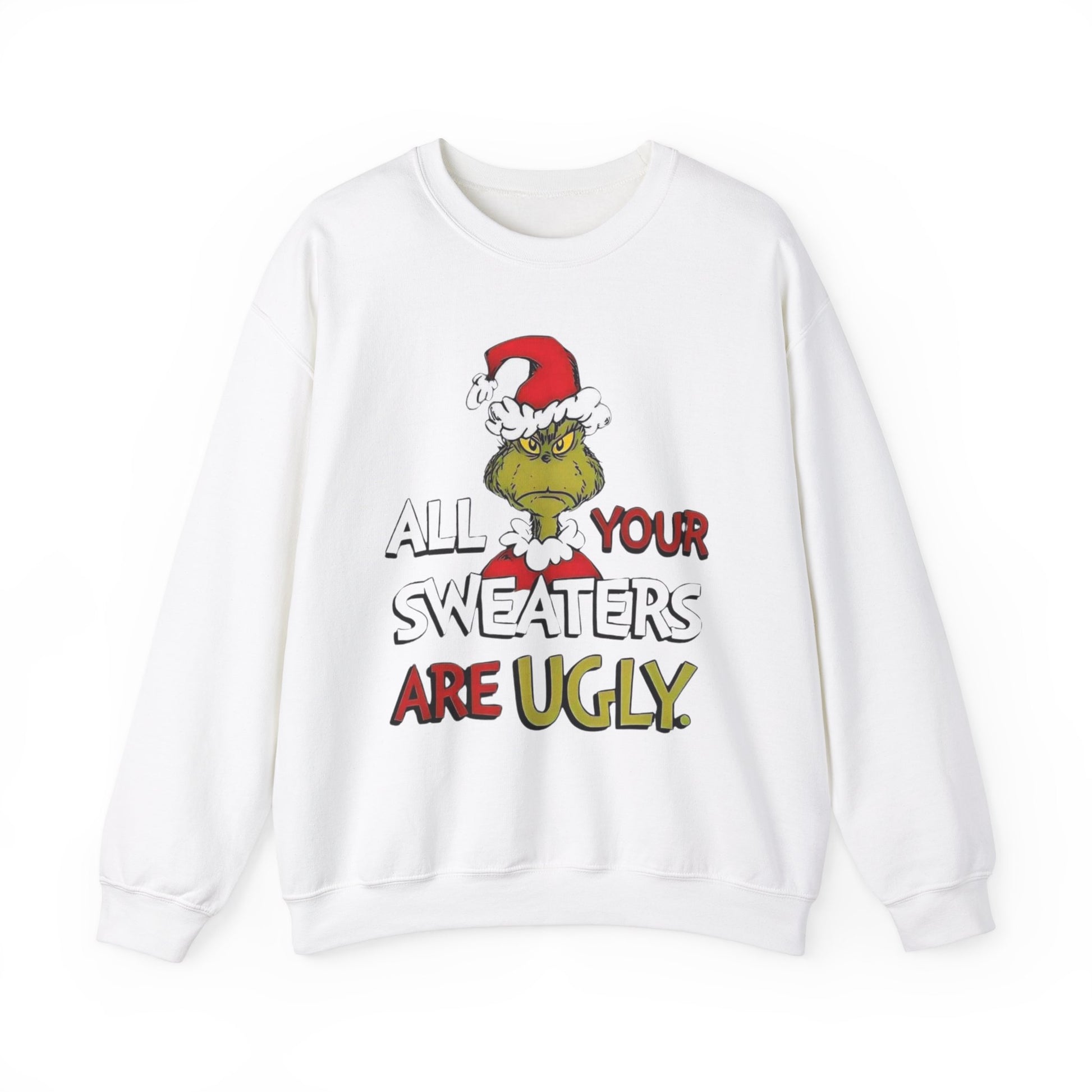 Stay cozy and stylish with this Unisex Heavy Blend™ Crewneck Sweatshirt featuring the text "All Your Sweaters Are Ugly" with a picture of the Grinch. Perfect for those colder months, this sweatshirt offers a classic fit and comfy wearing experience. Ideal for Grinch fans and anyone looking to add a touch of humor to their winter wardrobe. Great for Christmas gatherings and holiday parties.
