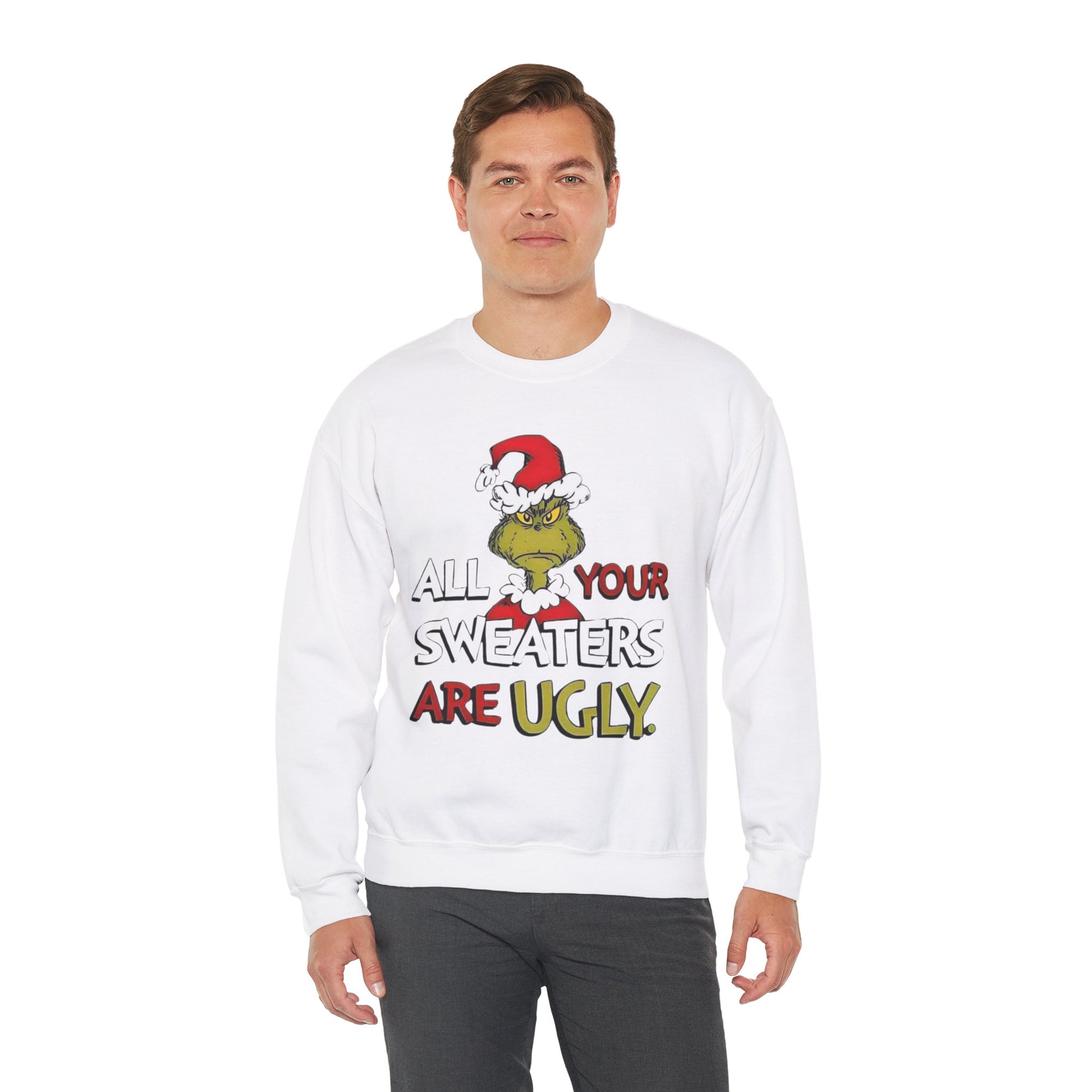 Stay cozy and stylish with this Unisex Heavy Blend™ Crewneck Sweatshirt featuring the text "All Your Sweaters Are Ugly" with a picture of the Grinch. Perfect for those colder months, this sweatshirt offers a classic fit and comfy wearing experience. Ideal for Grinch fans and anyone looking to add a touch of humor to their winter wardrobe. Great for Christmas gatherings and holiday parties.
