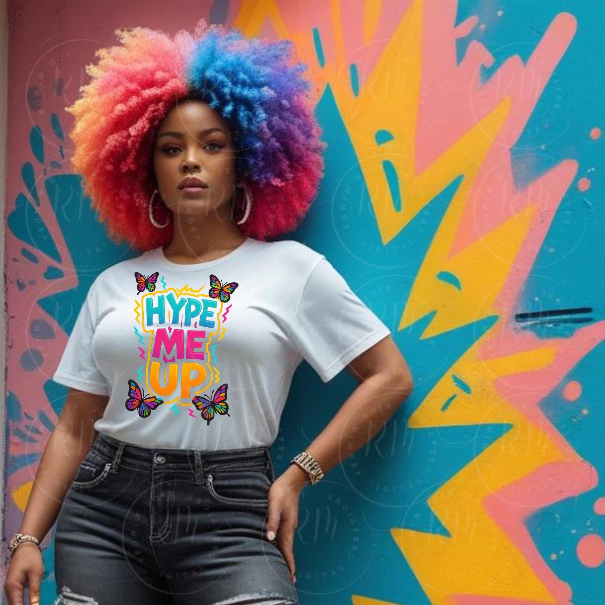 Get ready to turn heads and boost vibes with this bold and colorful Hype Me Up PNG clipart! This electrifying digital design features graffiti-style ombré text, dainty multicolor butterflies, neon lightning bolts, and juicy gems—all laid out to scream BADDIE ENERGY. Perfect for sublimation, print-on-demand, or adding a little razzle-dazzle to your creative projects!