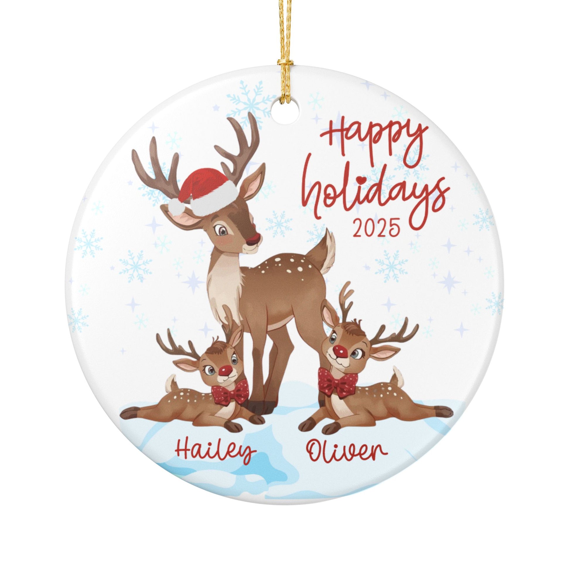 Bring a little gentle holiday charm to the tree with this round ceramic ornament. The glossy white ceramic provides a bright backdrop for a matte-printed illustration of a mama reindeer and two fawns in a snowy scene, accented with a warm “Happy Holidays 2025” script and space for two names. The ornament hangs from a gold string that adds a subtle shimmer among branches. Lightweight yet sturdy, it feels personal and handwritten — a quiet keepsake that marks a moment in time and joins family traditions year after year.