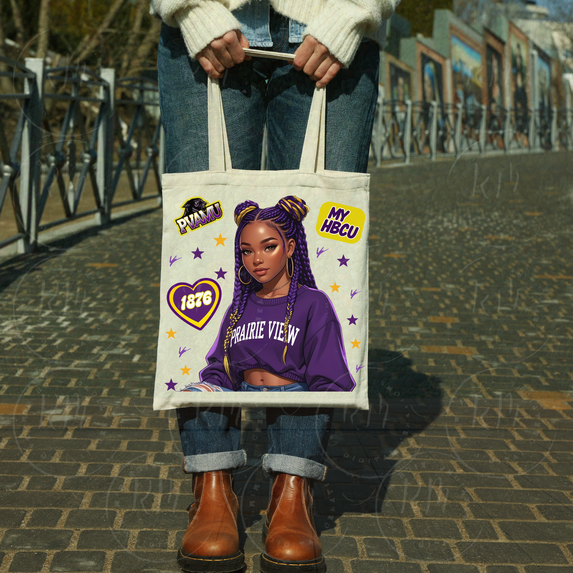Celebrate your pride with this vibrant Prairie View A&M University Girl Clipart, perfect for creating standout t-shirts, mugs, and other merchandise. Featuring a stylish Black woman with purple and yellow braids, this design includes stars, a heart showcasing the school's founding year, the mascot, and the empowering phrase "My HBCU." Ideal for fans and alumni, this sublimation PNG brings your HBCU spirit to life with bold, meaningful imagery. Add a touch of heritage and style to your creations today!