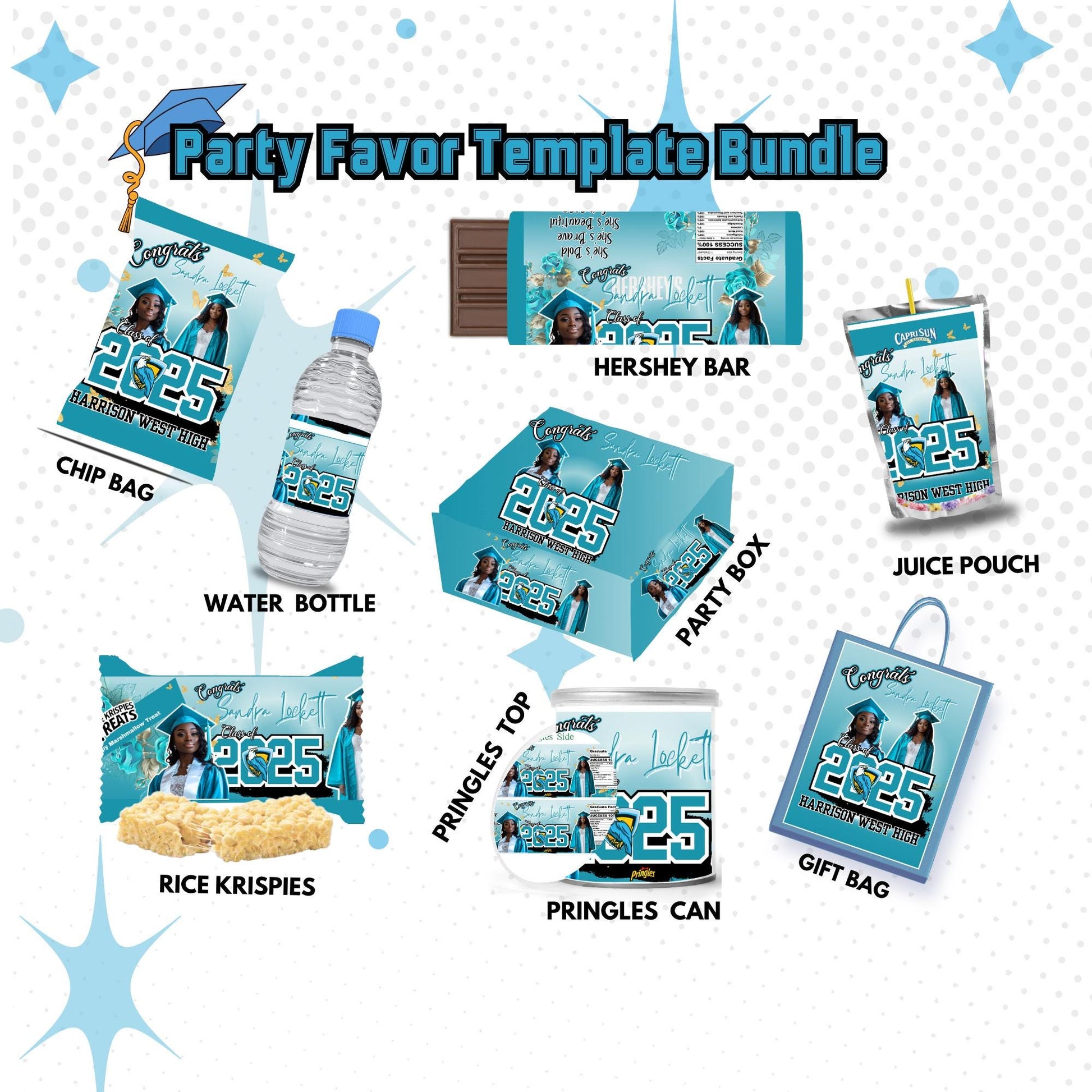This Bundle includes 9 different Party Templates: Chip Bag Label, Pringles Top, Pringles Can, Rice Krispies Label, Hershey's Label, CapriSun Label, Water Bottle Label, Party Bag, and Party Box.