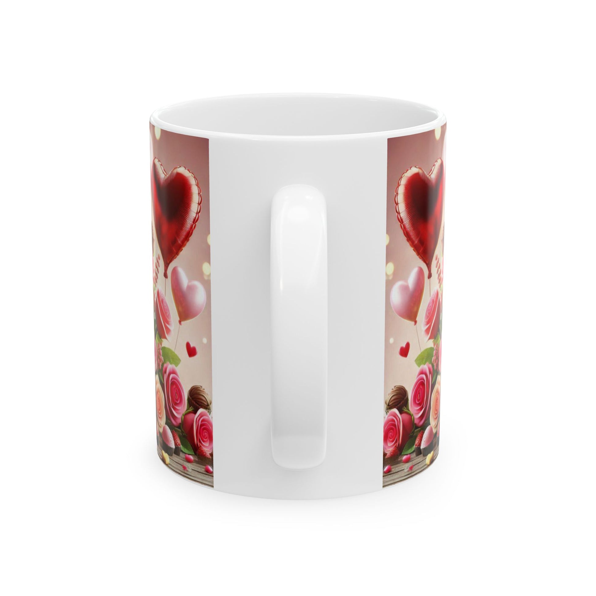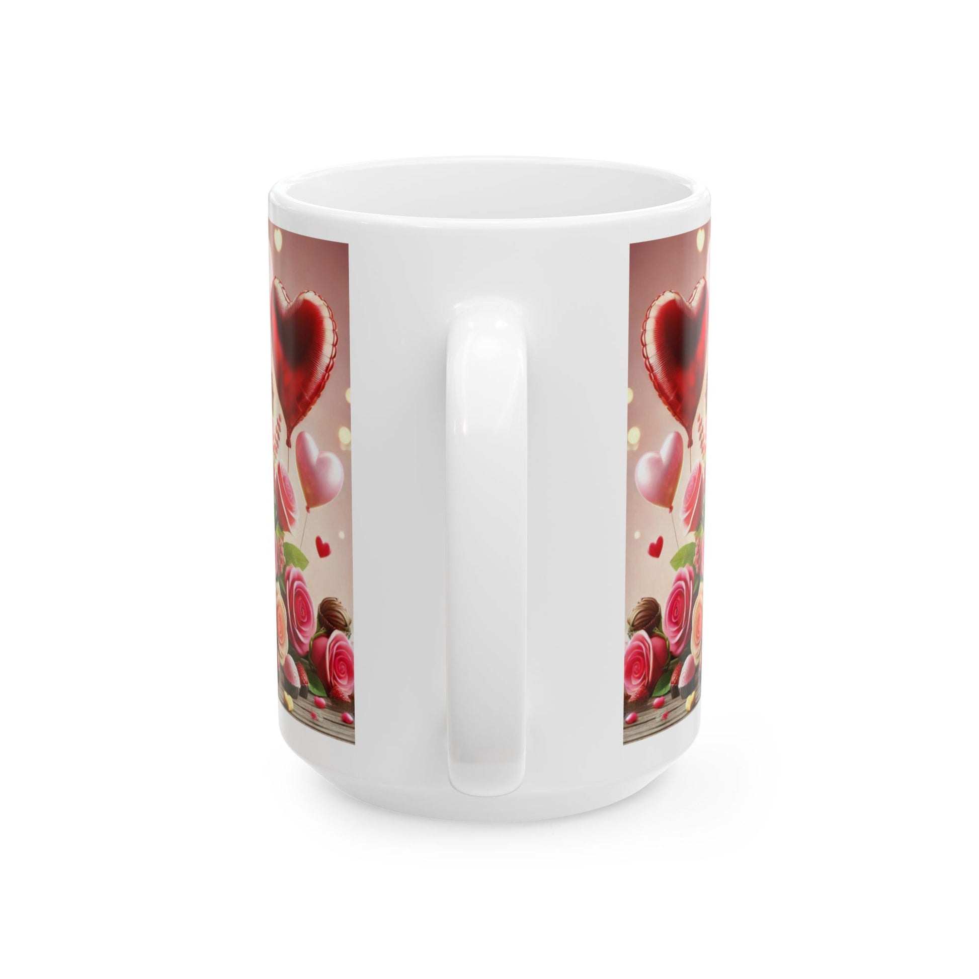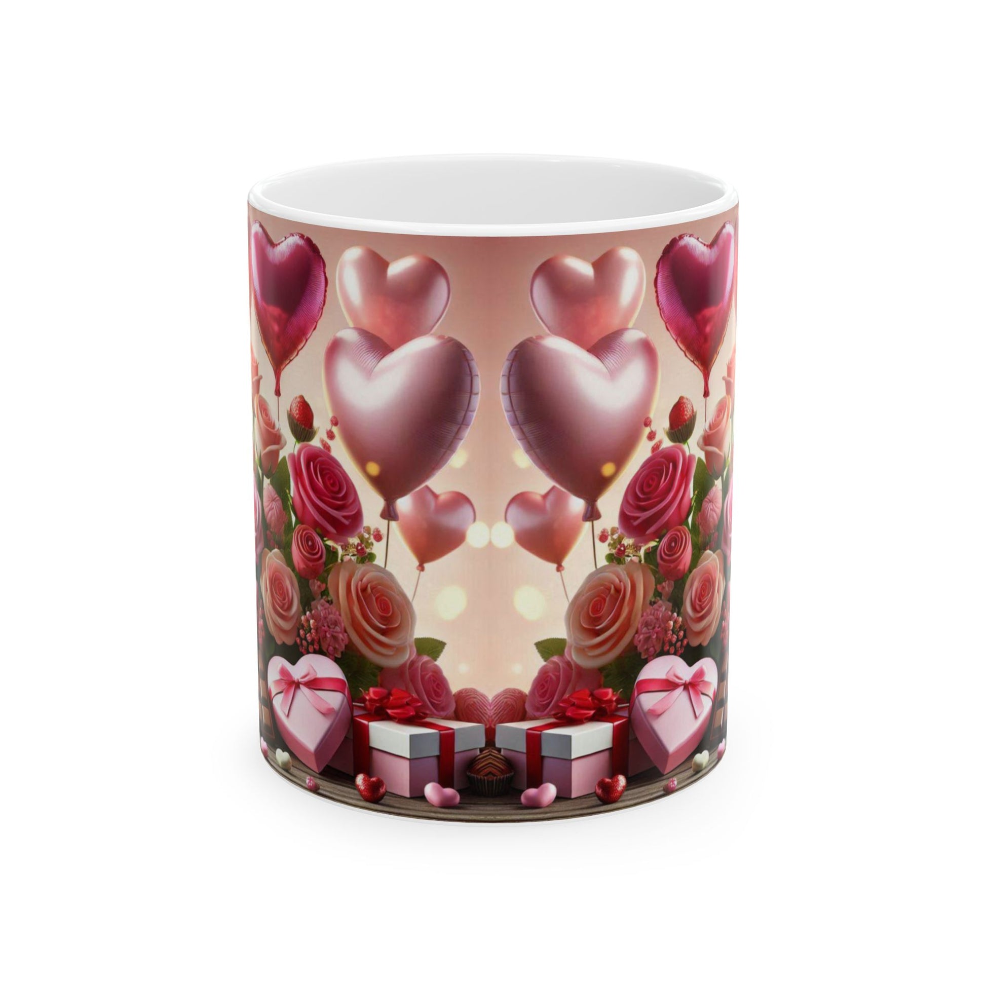 Valentine's Day Ceramic Mug, Pink and White Valentine's Coffee Cup, Romantic Valentine's Gift, 11oz, 15oz - Balloons, Roses, Chocolates